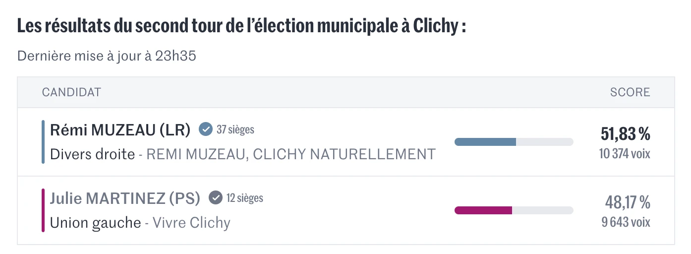 "Des procurations ne figurant pas sur le registre de la préfecture des Hauts-de-Seine, des électeurs qui se retrouvent nez à nez avec des inconnus votant à leur place… À Clichy, 7 plaintes ont été déposées pour usurpation d’identité. La candidate PS Julie Martinez (PS) a formulé un recours après la réélection de Rémi Muzeau (LR)."