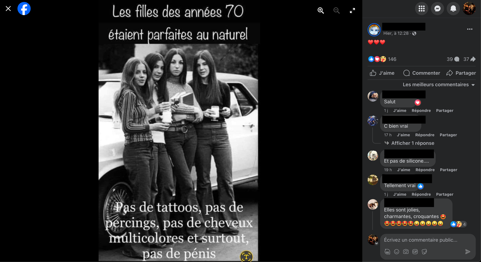 Facebook est également un puits infini de groupes partageant des contenus plus gênants les uns que les autres pour les plus jeunes, qui découvrent la réalité d'un décalage majeur dans l'humour en ligne avec les plus vielles générations. Visuels pixelisés, montages ratés ou illisibles, blagues éculées, sexistes ou très très discutables… c'est un festival. Voici un petit exemple de « blague », garantie sans IA, qui mêle transphobie et tout ce que j'ai cité ci-dessus. Exemple qui est – je le jure – le premier sur lequel je suis tombé en ouvrant un des nombreux groupes "nostalgie des années XX" sur Facebook. Qu'est-ce qu'on rigole ! Les commentaires sont à l'avenant.