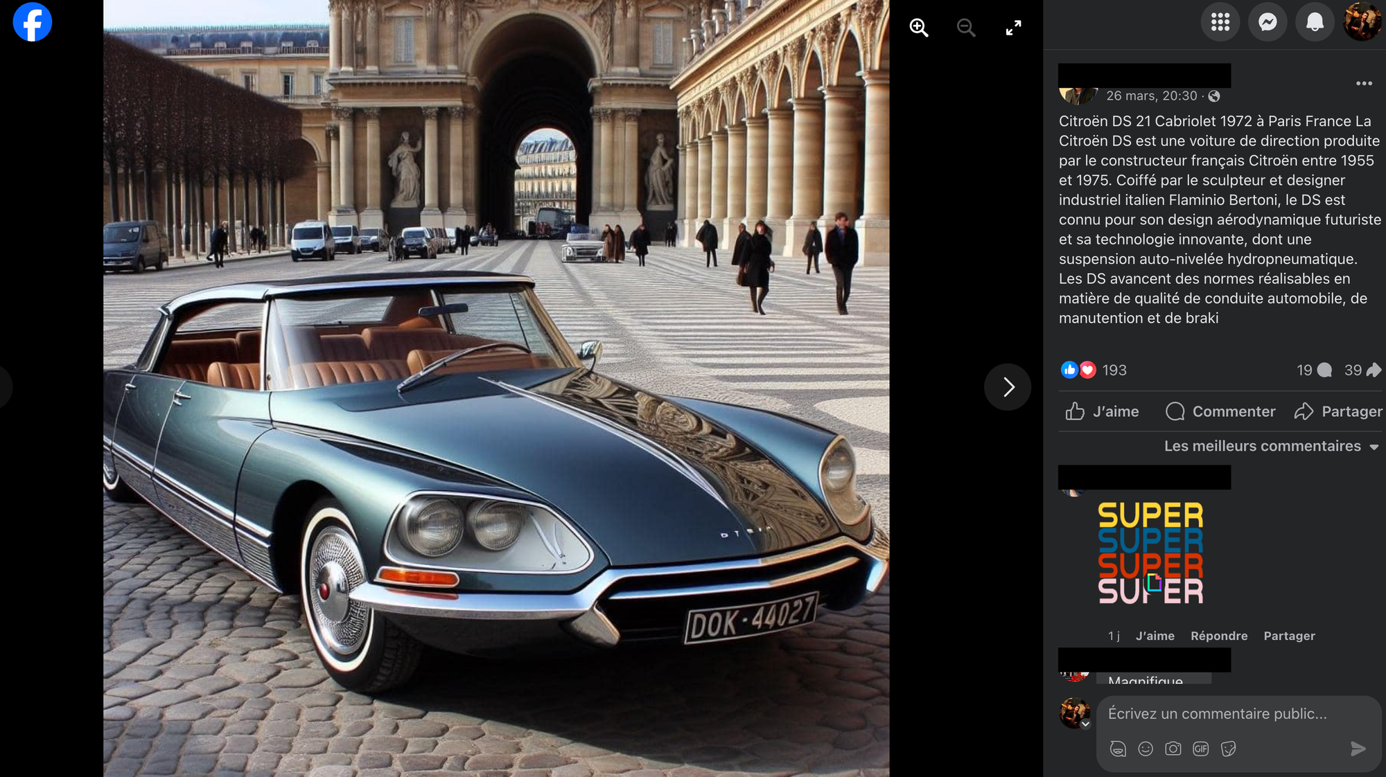 Allez, minute tutoriel pour les moins initiés : comment détecter qu'une image est générée par IA ? Prenons l'exemple d'un post que j'ai trouvé récemment sur Facebook. Les 193 afficionados de la Citroën DS qui ont liké ce post n'ont probablement pas remarqué qu'il ne s'agissait pas du tout d'une DS, mais d'une pâle copie. Comment je le sais ? Alors :