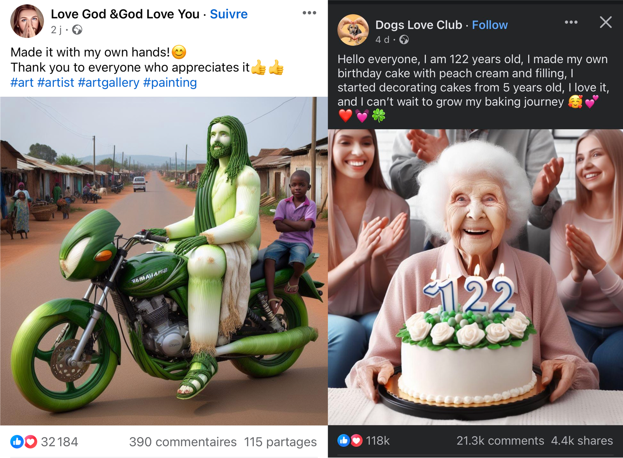 L’intelligence artificielle, nous y arrivons. Car depuis quelques mois, on assiste à un nouveau phénomène assez étonnant. La multiplication exponentielle de visuels réalisés via IA générative sur Facebook, au sein de cercles et de groupes fréquentés essentiellement pas des personnes de plus de 50 ans. Et quels visuels ! Des images tout droit sorties de vos pires cauchemars, likés en masse par des utilisateurs qui ne semblent pas se rendre compte que ce sont des faux. Une sculpture de Jésus en moto réalisée en poireaux géants !? Une pseudo-mamie de 122 ans à la peau de pêche, accompagnée d'une famille constituée de top models La Redoute, tout ce beau monde réuni autour d'un gâteau d’anniversaire on ne peut plus chelou ? Tout cela est totalement faux, mais cela n'empêchera pas des milliers d'utilisateurs de liker, commenter, repartager. Et d'après plusieurs chercheurs ayant creusé le phénomène, il semblerait bien que la majorité des utilisateurs ne se rendent absolument pas compte qu'ils ont à faire à des images générées par IA. Si vous n'avez pas encore votre dose de cringe pour la journée, n'hésitez pas à aller voir cette page Facebook, à l'origine dudit Jésus. Elle publie des dizaines d'images générées par IA chaque jour. On est sur un niveau de gêne extrême. Profitez-bien.