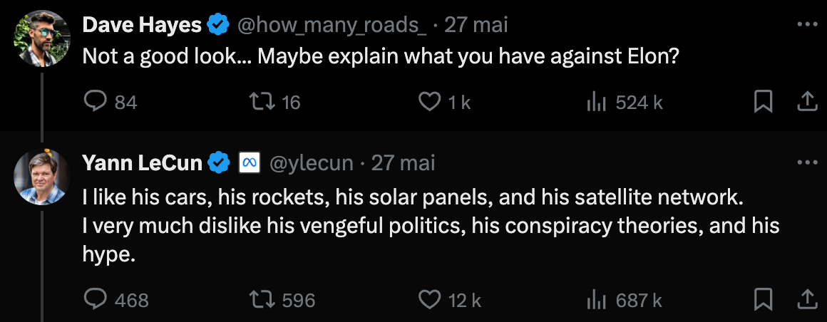 Si l'échange Musk-LeCun a débuté au sujet de leurs positions divergentes concernant l'IA, les choses ont vite dérapé sur leurs visions de la science voire de la politique. Je ne vais pas vous lister l'intégralité des tweets, d'autant qu'ils ont bien été analysés, par Numérama notamment. Résumons : sur l'IA elle-même, LeCun critique les annonces sensationnalistes de Musk. Mais c'est ensuite que cela devient croustillant.