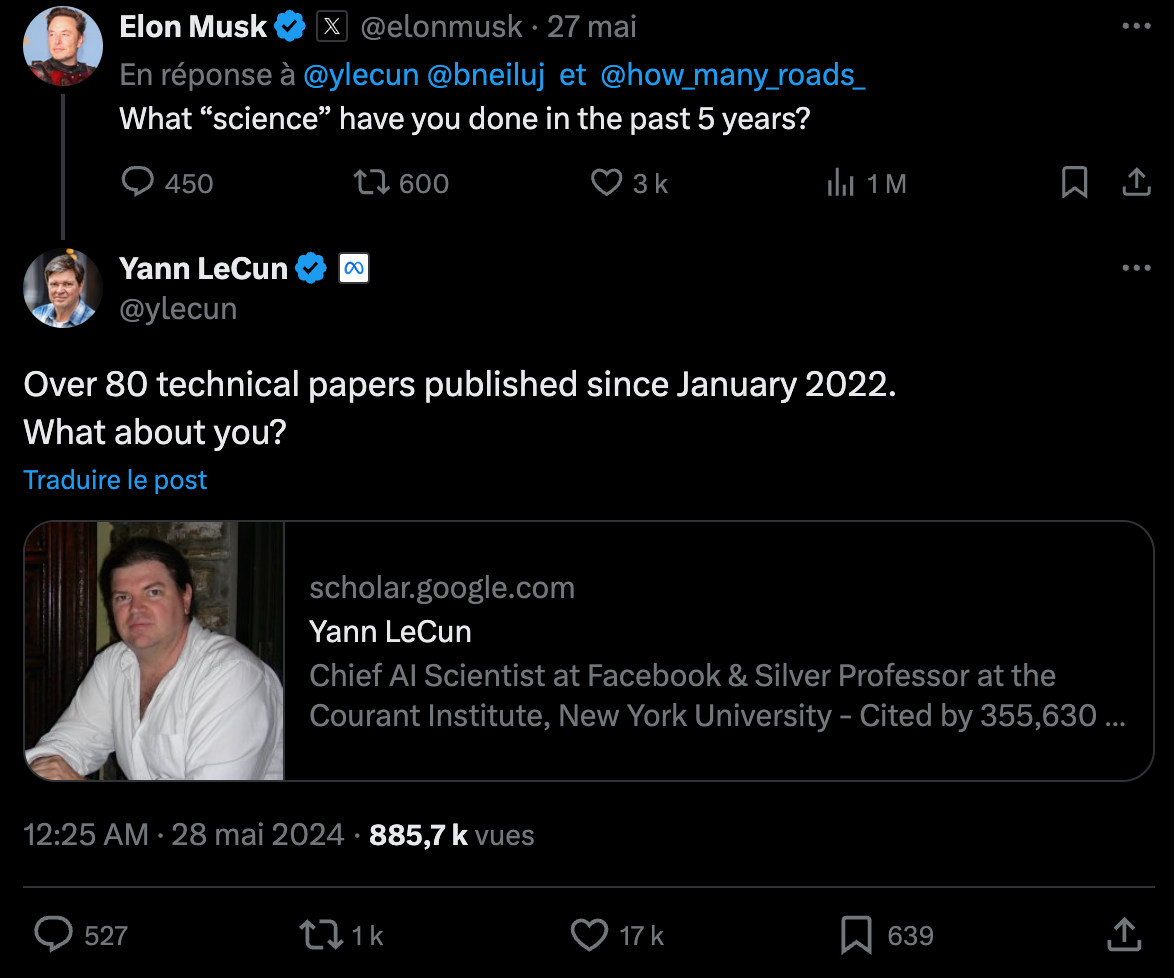 Voilà dans les grandes lignes. Et que cet échange a fait parler ! Qu'il a fait jubiler les critiques de Musk ! La presse en a pondu un beau nombre d’articles, toutes les plateformes sociales, de X à Linkedin en passant par Threads ou Instagram, en ont discuté à tort et à travers. Cela a continué encore récemment avec une découverte : Elon Musk ne suit plus Yann LeCun sur Twitter. Ouh! Drama! Globalement, ce qu'il ressort de ces fadaises, c'est plutôt un soutien à LeCun, et on peut le comprendre : il est trop rare de voir Musk en prendre plein la tête comme cela, et il faut savoir profiter des bonnes choses.